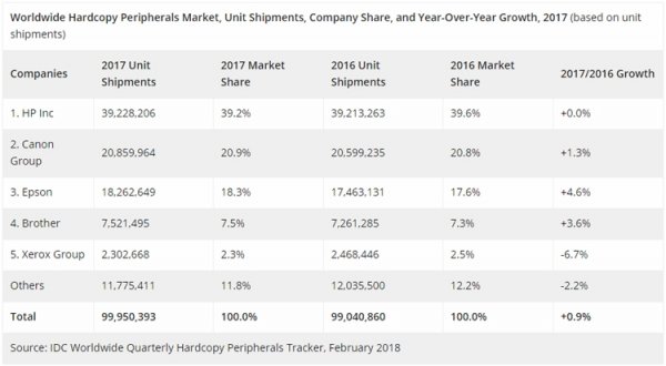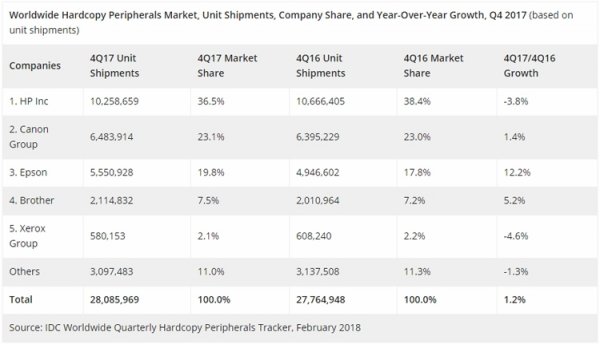 Компания International Data Corporation (IDC) представила результаты исследования глобального рынка печатающей техники (Hardcopy Peripherals, HCP). Обнародованные данные учитывают поставки традиционных принтеров разных типов (лазерные, струйные), многофункциональных устройств, а также копировальных аппаратов. В последней четверти 2017 года в мировом масштабе было поставлено приблизительно 28,1 млн печатающих устройств. Это на 1,2 % больше по сравнению с четвёртым кварталом 2016 года, когда объём рынка оценивался в 27,8 млн единиц. В пятёрку крупнейших производителей входят HP Inc, Canon Group, Epson, Brother и Xerox Group. Их рыночные доли по итогам прошлого квартала составили соответственно 36,5 %, 23,1 %, 19,8 %, 7,5 % и 2,1 %. Если рассматривать объём отрасли в деньгах, то по итогам квартала отмечено 1-процентное падение — до $13,7 млрд. Годовой объём мирового рынка печатающей техники достиг знаковой отметки в 100 млн единиц, увеличившись по сравнению с 2016 годом примерно на 0,9 %. Пятёрка ведущих поставщиков представлена компаниями HP Inc (39,2 %), Canon Group (20,9 %), Epson (18,3 %), Brother (7,5 %) и Xerox Group (2,3 %).