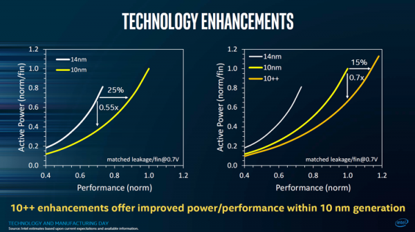 Видов техпроцессов Intel, помимо «простых» 14-нм и 10-нм, уже набралось немало. Каждый этап «взросления» технологической нормы обозначается на презентационных слайдах плюсом. Кульминацией доработки 14-нм нормы станут процессоры Whiskey Lake-U («14++» или даже «14+++»). В свою очередь существующие опытные образцы SoC Ice Lake-U и Ice Lake-Y используют «10+»-нанометровую норму. Эволюция производственных технологий преследует цель улучшить соотношение быстродействия и энергопотребления CPU/SoC с поправкой на потребности рынка в конкретный период.