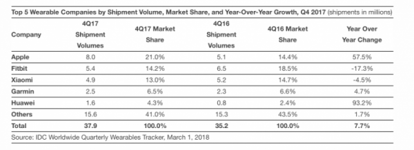 Fitbit, которая удерживала пальму первенства по итогам последних трёх месяцев 2016 года, за аналогичный период 2017-го поставила 5,4 млн носимых устройств, что на 17,3 % меньше показателя годичной давности.