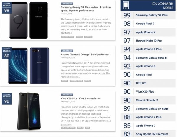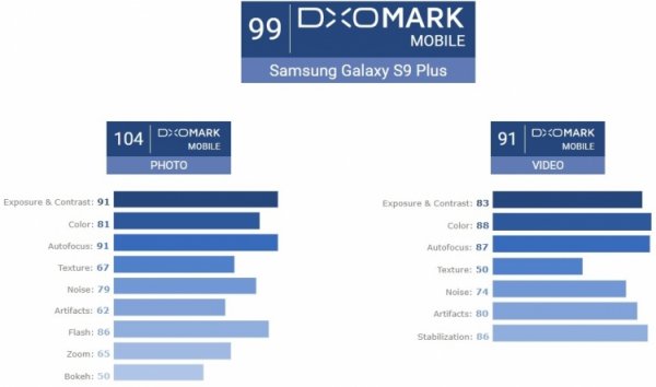 В фототесте камера Galaxy S9 Plus суммарно набрала 104 балла, а за видеосъёмку сотрудники DxOMark присудили ей 91 балл. Итоговым результатом для смартфона стали рекордные 99 балла и, как следствие, почётное первое место в рейтинге.