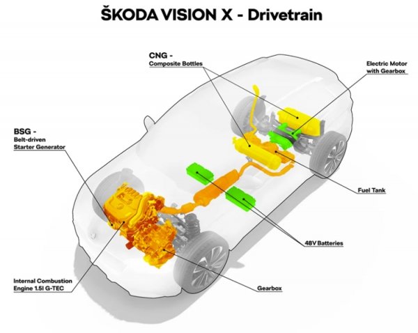 Бренд ?koda рассказал о концептуальном автомобиле Vision X, который будет демонстрироваться на Международном автосалоне в Женеве с 6 по 18 марта 2018 года. Vision X — это современный городской кроссовер. Главная особенность машины заключается в использовании гибридной силовой установки, которая может функционировать на сжатом природном газе, бензине и электричестве. Силовая платформа концепта объединяет стартер-генератор, электромотор и четырёхцилиндровый турбированный двигатель внутреннего сгорания 1.5 TSI G-TEC. Последний обеспечивает мощность до 96 кВт (130 лошадиных сил) и крутящий момент до 250 Н·м. Для хранения сжатого газа имеются два баллона, расположенные под задним сиденьем и за задней осью. Причём именно газ является основным видом топлива. Для бензина, переход на который осуществляется при необходимости, предусмотрен резервный топливный бак. В концепте полноприводная схема реализована без традиционного карданного вала. Передние колёса приводит в движение двигатель внутреннего сгорания; задние колёса имеют электрический привод. Такая комбинация способна при необходимости обеспечить и максимально эффективный разгон, и движение по скользким дорогам/бездорожью. Причём электрический привод задних колёс задействуется только по необходимости. Электромотор на задней оси питается от 48-вольтовой литий-ионной батареи. Благодаря рекуперации аккумулятор подзаряжается при торможении автомобиля и движении накатом: кинетическая энергия не расходуется впустую, а преобразуется в электрическую и впоследствии используется для движения. Максимальный крутящий момент в 70 Н·м электродвигатель обеспечивает сразу после включения, что гарантирует быстрый отклик и прекрасную динамику. Исключительно на электротяге машина может проехать до двух километров. Vision X в зависимости от дорожной ситуации может быть передне-, задне- или полноприводным. Разгон с места до 100 км/ч занимает 9,3 секунды. Максимальная скорость кроссовера достигает 200 км/ч. Суммарный запас хода — до 650 км.