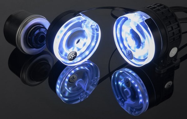 RGB-подсветка используется не только в водоблоках полного покрытия EK Water Blocks, но и в помпах компании. Новинка EK-XTOP Revo D5 RGB PWM получила настраиваемую подсветку и ценник в €129,90. Прозрачная крышка помпы позволяет насладиться игрой красок, а мотор EK-D5 PWM G2 (с опцией регулировки режима от 20 до 100 %) прокачивает до 1500 литров жидкости в час.