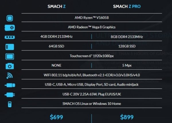 Модель Smach Z выделяется на фоне ближайших конкурентов по рынку, коих насчитывается всего несколько моделей, уникальной аппаратной компоновкой. В основу игрового гаджета лёг четырёхъядерный AMD Ryzen Embedded V1605B с графическим ускорителем Radeon RX Vega 8, а «лицом» консоли стал 6-дюймовый экран с разрешением Full HD. Объём оперативной памяти типа SO-DIMM DDR4-2133 у стандартной версии Smach Z равен 4 Гбайт, в то время как модель Smach Z Pro получит целых 8 Гбайт ОЗУ. В обоих случаях для хранения контента предлагается SSD-накопитель: в Smach Z — на 64 Гбайт, а в Smach Z Pro — на 128 Гбайт.