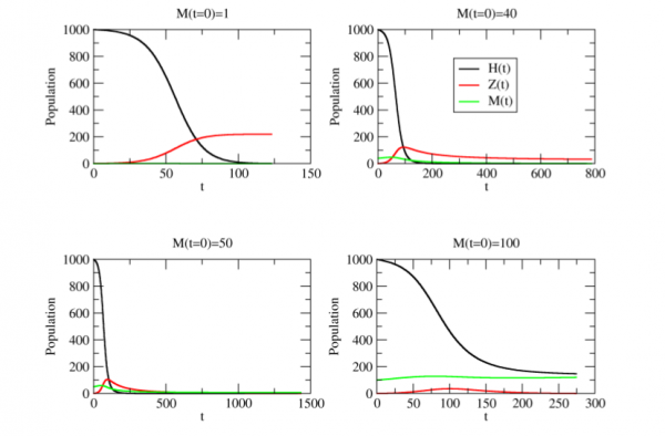 Как правило, подобные статистические модели включают два типа участников: обычных людей и зомби. Группа бразильских физиков под руководством Жуана Паулу де Мендосы (Jo?o Paulo A. de Mendon?a) из Университета Жуиса-ди-Форы разработала динамическую математическую модель вспышки зомби-эпидемии, в которую включила еще одну группу: военных, которые, в отличие от обычных людей, обладают средствами борьбы с зомби и могут эффективно их нейтрализовать.