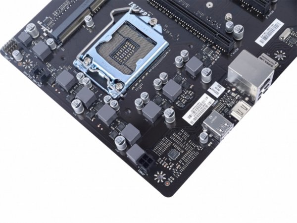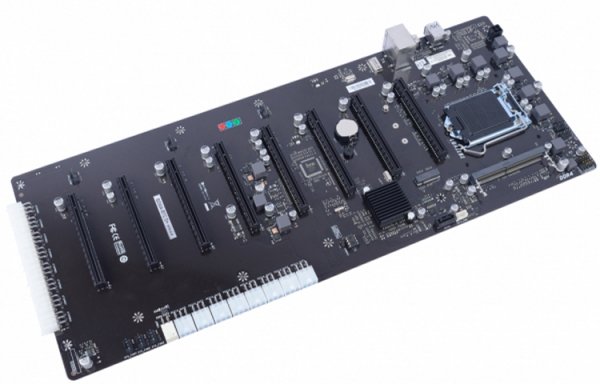 На плате располагаются восемь слотов PCI Express х16 (семь функционируют в режиме PCI Express x1, один — в режиме PCI Express x16). Таким образом, пользователи смогут установить восемь карт расширения для майнинга, не применяя райзеры.