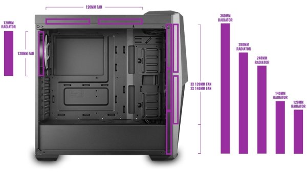 В системе охлаждения могут быть задействованы до шести вентиляторов. Допускается использование радиаторов жидкостного охлаждения формата 120/140/240/280/360 мм.