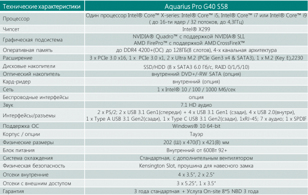 Пример конфигурации: Intel Core i9-7960X, NVIDIA Quadro P500, 32 Гбайт RAM, 256 Гбайт SSD, 2 Тбайт HDD. Рекомендуемая цена на данную версию Aquarius Pro G40 S58: $9000.