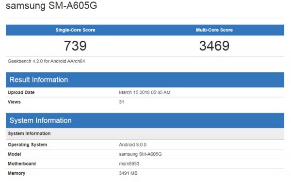 В базе данных бенчмарка Geekbench появилась информация сразу о двух новых смартфонах Samsung, которые в скором времени могут пополнить семейство Galaxy A Series. Аппараты фигурируют под кодовыми обозначениями SM-A600FN и SM-A605G. Наблюдатели полагают, что на коммерческий рынок эти устройства поступят под именами Galaxy A6 и Galaxy A6 . Итак, известно, что модель SM-A600FN несёт на борту фирменный процессор Exynos 7870. Этот чип содержит восемь ядер ARM Cortex-A53 с тактовой частотой до 1,6 ГГц, графический контроллер Mali-T830 и модем LTE Category 6, обеспечивающий возможность загрузки данных через мобильную сеть со скоростью до 300 Мбит/с. Объём оперативной памяти указан в размере 3 Гбайт. Аппарат SM-A605G, в свою очередь, оснащён процессором Qualcomm Snapdragon 625. Изделие объединяет восемь вычислительных ядер с архитектурой ARM Cortex-A53 (до 2,0 ГГц), графический ускоритель Adreno 506 и сотовый модем X9 LTE со скоростью передачи данных до 300 Мбит/с. Чип функционирует в тандеме с 4 Гбайт ОЗУ. Отмечается также, что в качестве программной платформы на обоих смартфонах применяется операционная система Android 8.0 Oreo. Другие характеристики новинок пока не раскрываются. Есть вероятность, что они будут различаться размером дисплея и параметрами камер.