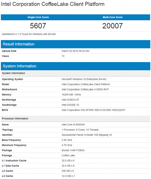 В базе результатов бенчмарка Geekbench 4 мы обнаружили записи, содержащие упоминания о трёх из пяти процессоров Coffee Lake-H — Core i5-8300H, Core i7-8750H и Core i9-8950HK. Младший четырёхъядерный процессор с частотой 2,3 ГГц набрал максимум 16 620 очков при загрузке всех x86-ядер и 4985 очков на одном ядре. Это чуть ниже уровня популярной среди производителей ноутбуков модели Core i7-7700HQ (до 5348/17 292 очка) семейства Kaby Lake-H.