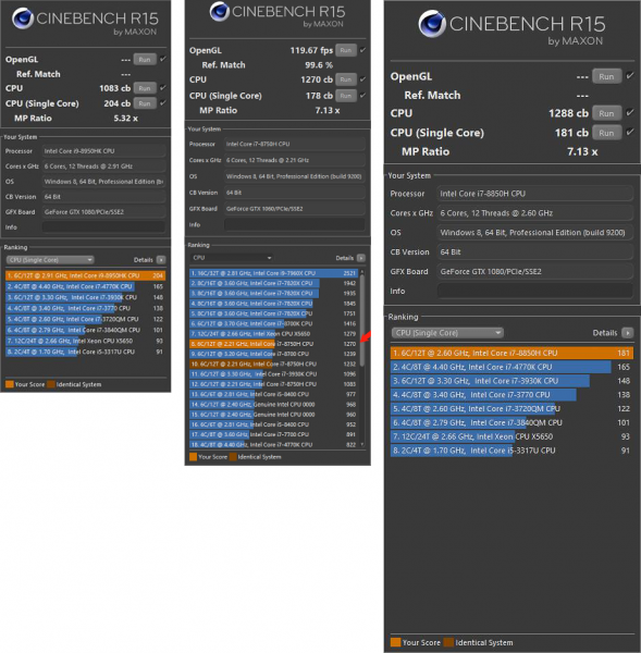 Китайский ресурс Wobenben порадовал энтузиастов, томящихся в ожидании шестиядерных мобильных CPU Intel, результатами Core i7-8750H, Core i7-8850H и Core i9-8950HK в популярном приложении Cinebench R15. Двум младшим моделям из списка удалось «выбить» 1270–1288 очков в многопоточном режиме и 178–181 очко в однопоточном. Таким образом, был продемонстрирован промежуточный уровень производительности между настольными процессорами Core i5-8600K и Core i7-8700K.