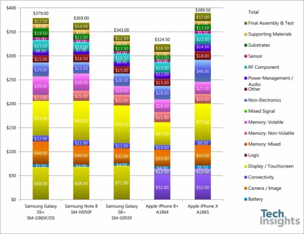 Согласно TechInsights модель Galaxy S9+ оказалась самым дорогим смартфоном из когда-либо выпущенных южнокорейским брендом. Гаджет обходится Samsung примерно в $379, что на $10 больше подсчитанной по аналогичной методике себестоимости Galaxy Note8.