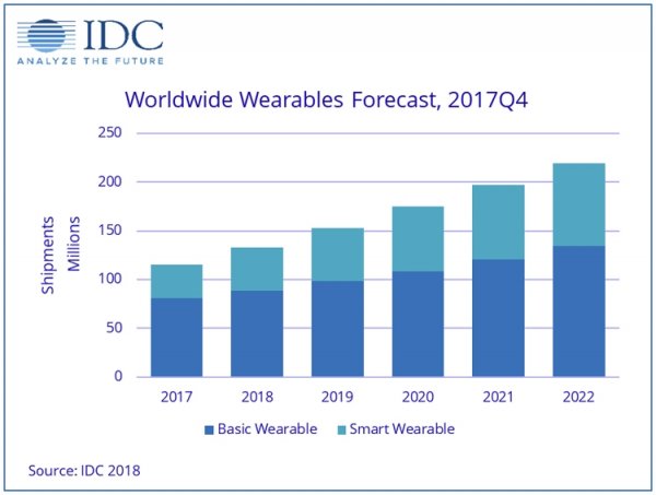 В течение пяти лет среднегодовой темп роста в сложных процентах (показатель CAGR) на глобальном рынке носимых устройств ожидается на уровне 13,4 %. В результате, в 2022 году поставки достигнут 219,4 млн единиц.