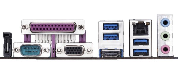 На планке с разъёмами сосредоточены три аудиогнезда, параллельный и последовательный порты, интерфейсы D-Sub и HDMI для вывода изображения, четыре порта USB 3.0 и гнездо для сетевого кабеля. Гарантирована совместимость с операционной системой Windows 10.