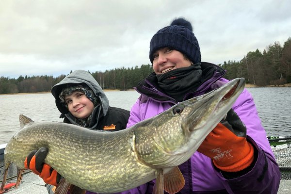 Антон достает смартфон и показывает фотографии с одной из прошлогодних рыбалок — на них женщина с ребенком, бережно держащие большую щуку: