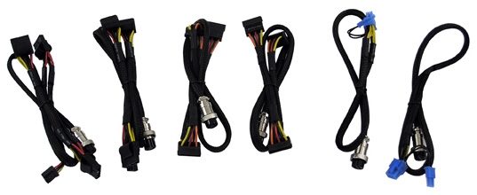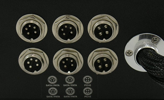 Каждый из шести разъёмов DIN имеет резьбу, поэтому отсоединяемые кабели, по логике вещей, должны надёжно фиксироваться. Минусом этих редко используемых в современных БП разъёмов является то, что их контакты постоянно находятся под напряжением и, в отсутствие защитных колпачков, могут стать причиной короткого замыкания.