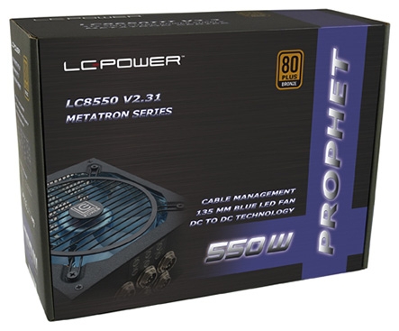 Модель LC8550 Prophet первой из представителей серии LC-Power Metatron Gaming прошла проверку на соответствие стандарту ATX12V v2.31 (все предыдущие — ATX12V v2.3). Уровень КПД у неё по нынешним меркам средний — 80 PLUS Bronze. Некоторые кабели, а именно ATX и «4 + 4»-контактный EPS12V, не отсоединяются. В комплект поставки включены силовые кабели с «6 + 2»-контактными разъёмами PCI-E Power (2 шт.), 4-контактным Molex (6 шт.), SATA Power (6 шт.) и FDD Power (2 шт.). Длина кабелей составляет от 55 до 90 см.