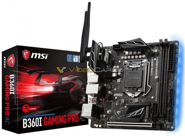 Одна из плат игровой серии — MSI B360I Gaming Pro AC — выполнена в форм-факторе Mini-ITX (170 ? 170 мм). В её составе используются дроссели с улучшенным отводом тепла, миниатюрные радиаторы VRM, низкопрофильный чипсетный теплосъёмник (над ним может находиться M.2 SSD), два слота DIMM DDR4, усиленный металлической рамкой слот для видеокарты PCI-E 3.0 x16 и четыре SATA 6 Гбит/с. Модуль беспроводной сети Wi-Fi (802.11ac)/Bluetooth укомплектован двумя отсоединяемыми антеннами.