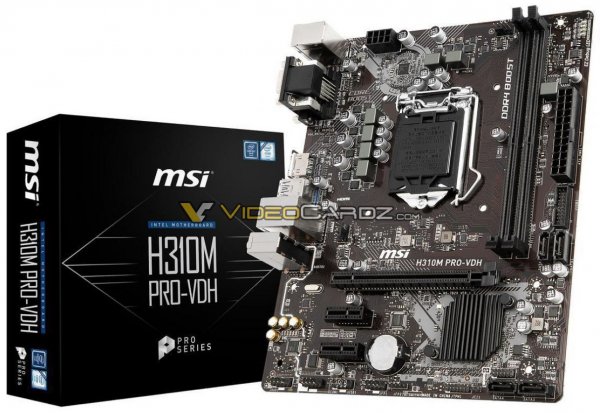 Другие компактные модели MSI PRO базируются на чипсете H310, и начнём мы с H310M PRO-VDH. С применением микросхемы Intel H310, в частности, связано малое общее количество разъёмов (2 ? DIMM DDR4, 1 ? PCI Express 3.0 x16, 4 ? SATA 6 Гбит/с) и использование слотов PCI-E 2.0 x1 для карт расширения вместо PCI-E 3.0 x1.