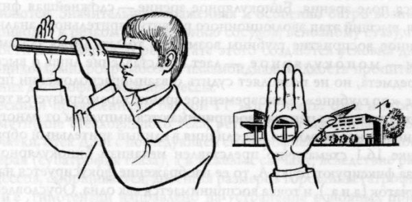 Приложите трубку к правому глазу и посмотрите вдаль. Левую руку приставьте к дальнему концу трубки с левой стороны.
