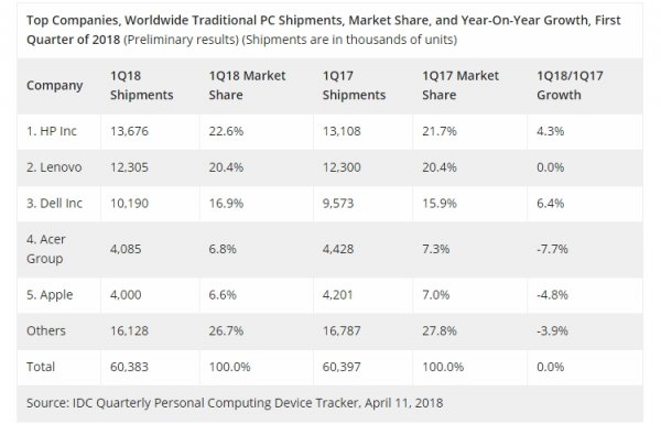 Компания International Data Corporation (IDC) обнародовала статистику по мировому рынку традиционных персональных компьютеров за первый квартал 2018 года. Представленные данные включают поставки настольных компьютеров, ноутбуков и рабочих станций, но не учитывают отгрузки планшетов и серверов с архитектурой х86. Итак, сообщается, что в период с января по март включительно в глобальном масштабе было реализовано 60,4 млн компьютеров. Такой же результат был продемонстрирован в первой четверти 2017 года. Иными словами, рынок остался стоять на месте. Крупнейшим поставщиком является компания HP с 13,7 млн отгруженных устройств и долей в 22,6 %. На втором месте находится Lenovo, реализовавшая 12,3 млн компьютеров и занявшая в результате 20,4 % мирового рынка. Замыкает тройку Dell — 10,2 млн поставленных компьютеров и 16,9 % отрасли. Далее следуют Acer (4,1 млн; 6,8 %) и Apple (4,0 млн; 6,6 %). Все прочие поставщики в течение квартала сообща реализовали 16,1 млн персональных компьютеров. Их суммарная доля оказалась на уровне 26,7 %. Нужно отметить, что в целом ситуация на глобальном ПК-рынке оказалась лучше, чем прогнозировали аналитики. Ранее эксперты говорили, что отрасль может показать 1,5-процентный спад в годовом исчислении.