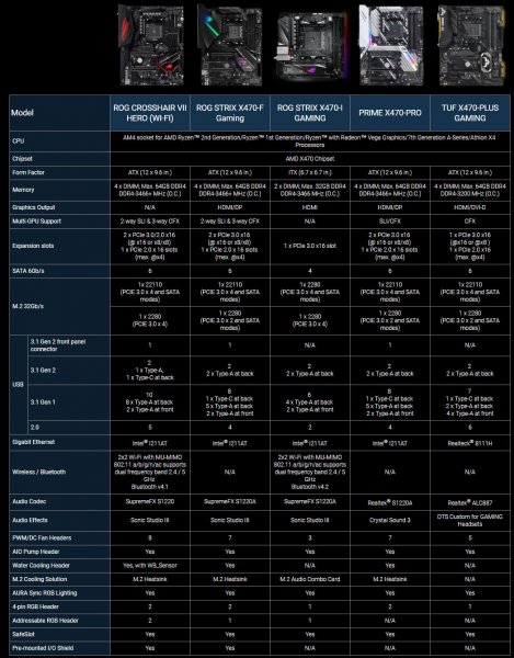 В семейство вошли модели ROG Crosshair VII Hero (Wi-Fi), ROG Strix X470-F Gaming, ROG Strix X470-I Gaming, Prime X470-PRO и TUF X470-PLUS Gaming. Все они выполнены на наборе системной логики AMD X470.