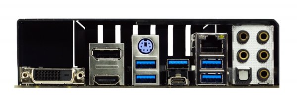 Задняя планка предлагает следующий набор разъёмов: гнездо PS/2 для клавиатуры/мыши, по одному порту USB 3.1 Gen2 Type-C и USB 3.1 Gen2 Type-А, четыре порта USB 3.0 Gen1, интерфейсы DisplayPort, HDMI и DVI-D для подключения дисплеев, гнездо для сетевого кабеля и набор аудиогнёзд.