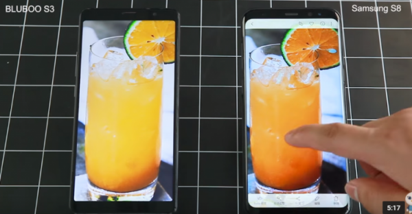 При тестировании экрана Bluboo S3 вполне уверенно смотрится рядом с Samsung Galaxy S8. Южнокорейский флагман оснащён топовым дисплеем Super Amoled Infinity Display, но экран Bluboo S3 на удивление не уступает ему по точности цветопередачи или детализации. Как видим, экран Bluboo S3 производства Sharp на базе технологии In-Cell с разрешением 2160 ? 1080 точек вполне способен создать удовлетворительный визуальный эффект.