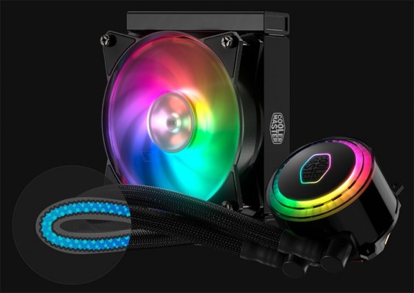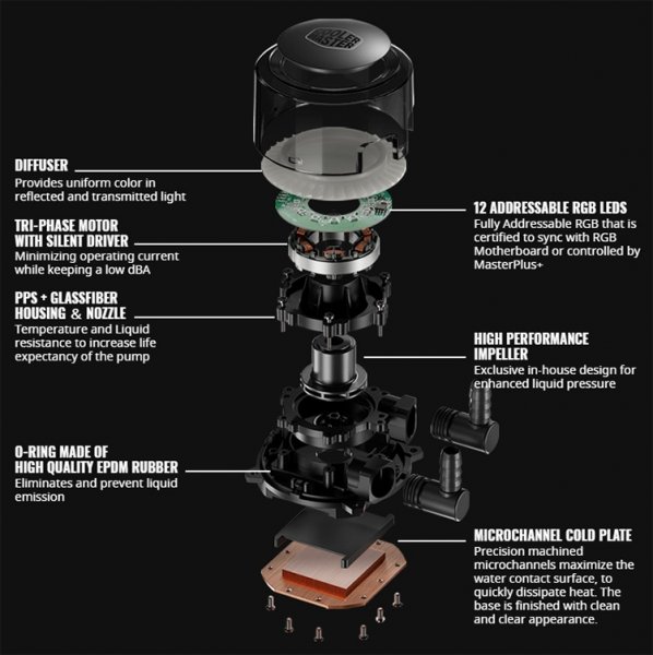 Новые системы охлаждения состоят из довольно крупного (83,6 ? 71,8 ? 52,7 мм) водоблока с медным основанием, массивом микропластин внутри и встроенной помпой, шлангов из фторированного этилен-пропилена (ФЭП) в нейлоновой оплётке, алюминиевого радиатора толщиной 27 мм и одного-двух вентиляторов MR120R ARGB типоразмера 120 ? 120 ? 25 мм. Используемая помпа характеризуется средним сроком наработки на отказ в 70 тыс. часов и издаёт не более 15 дБА шума. Вентилятор Cooler Master MR120R выделяется широким диапазоном скоростей (600–2500 об/мин), производительностью до 113,3 м?/ч и уровнем шума от 6 до 30 дБА, в зависимости от скорости.