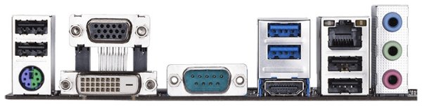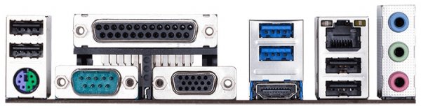 Сочетание разъёмов задней панели у H310M S2P почти то же, что и у H310 D3: место параллельного порта занял видеовыход DVI-D. Тем не менее возможность подключения LPT-принтера имеется, поскольку на PCB под слотом PCI-E 2.0 x1 находится штырьковый LPT.