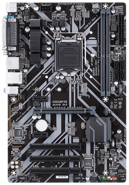Модель H310 D3 выделяется на фоне других бюджетных материнских плат LGA1151 наличием радиатора для транзисторов VRM, а также 8-контактного разъёма питания EPS12V вместо 4-контактного ATX12V.