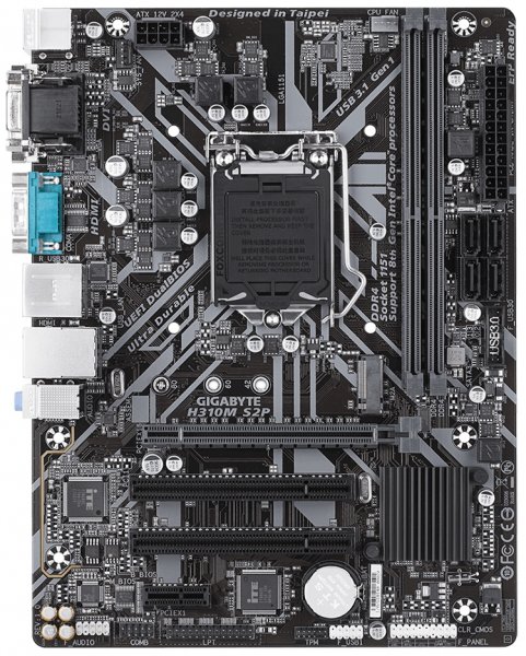 Возможности Micro-ATX платы Gigabyte H310M S2P в целом скромнее, чем у H310 HD3, в частности, предусмотрены только четыре слота для карт расширения — единичные PCI Express 3.0 x16 и PCI-E 2.0 x1, и пара PCI. Кроме того, несколько упрощена система питания и отсутствует разъём M.2 Socket 1 (CNVi).