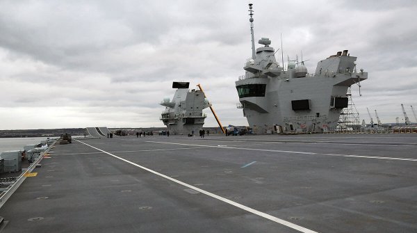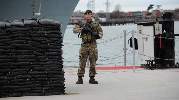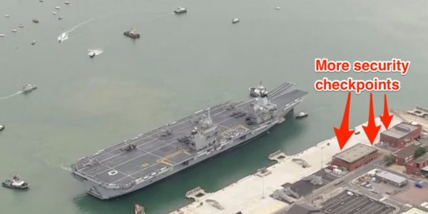 База Королевского флота Портсмут тщательно охраняется. Чтобы пройти к авианосцу, нужно миновать несколько контрольно-пропускных пунктов. Последние КПП расположены непосредственно на пристани, которую патрулируют морские пехотинцы, автоматические винтовки которых заряжены боевыми патронами. Вокруг авианосца постоянно патрулируют в формате 24/7 три полицейских судна .