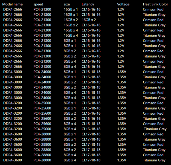 Все продукты новой серии делятся на группы — по цвету радиатора (Titanium Gray и Crimson Red), эффективной частоте (2666, 3000, 3200, 3600 МГц), объёму модулей (8 и 16 Гбайт), их количеству в одной упаковке (от одного до четырёх), формуле задержек памяти (от 16-16-16 до 17-18-18) и рабочему напряжению (1,2 В или 1,35 В). Соответственно, потенциальным покупателям предоставляется возможность приобрести самые разные продукты, правда, ёмкие 16-гигабайтные модули и комплекты XPG Spectrix D41 предлагаются пока только в виде DDR4-2666, в то время как 8-гигабайтные — в том числе в виде DDR4-3600.