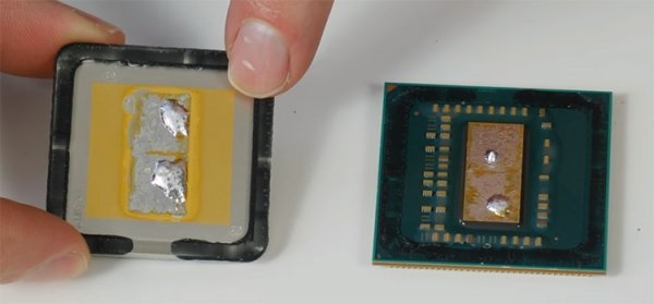 Между защитной крышкой и кристаллом CPU Pinnacle Ridge находятся слой позолоты (необходим для напаивания крышки на чип) и припой на основе индия. Монолитный кристалл содержит два четырёхъядерных блока CCX. Очистка поверхностей и нанесение тонкого слоя жидкого металла Thermal Grizzly между кремниевым кристаллом и медной никелированной крышкой позволило провести повторные тесты Ryzen 5 2600.