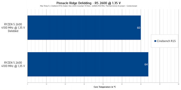 Как и раньше, пределом подопытного экземпляра стали 4,1 ГГц при напряжении 1,35 В. Максимальная температура под нагрузкой, которую обеспечивала программа Cinebench R15, составила 60 °C, что на 4 °C меньше первоначального показателя. По итогам испытаний Der8auer рекомендовал оверклокерам не повторять подобный опыт, поскольку AMD и так хорошо справилась с задачей передачи тепла от кристалла CPU к крышке. Если бы слой припоя был тоньше, разница в температурных показателях была бы ещё меньше.