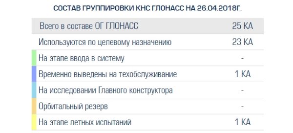 Российская группировка ГЛОНАСС, по всей видимости, лишилась одного из спутников. Об этом сообщают сетевые источники со ссылкой на заявления Николая Тестоедова, гендиректора компании «ИСС» имени академика М.Ф. Решетнёва», изготовителя аппаратов «Глонасс». Информация размещенная на сайте - «print-prime.ru» По данным ИАЦ КВНО (Информационно-аналитический центр координатно-временного и навигационного обеспечения) на 26 апреля 2018 года, в составе группировки ГЛОНАСС числятся 25 аппаратов. Из них 23 используются по целевому назначению, а один находится на этапе лётных испытаний. Ещё один аппарат — номер 734 — временно выведен из системы. Именно с ним и наблюдаются проблемы. «17 апреля произошёл отказ спутника