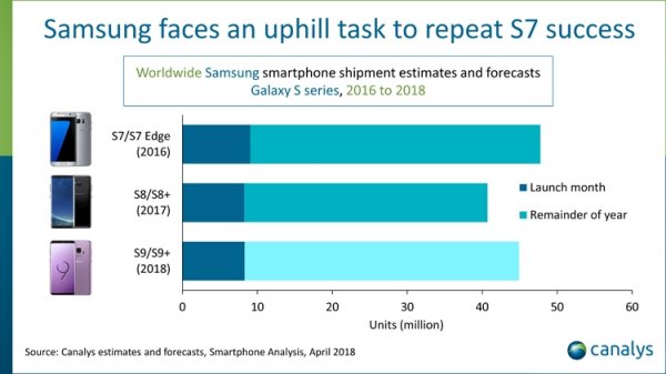 Объём продаж Galaxy S9/S9+ в текущем году в целом прогнозируется на уровне 44–45 млн единиц. Для сравнения: поставки аппаратов Galaxy S8/S8+ в год анонса составили около 41 млн штук, а Galaxy S7/S7 Edge — приблизительно 48 млн.