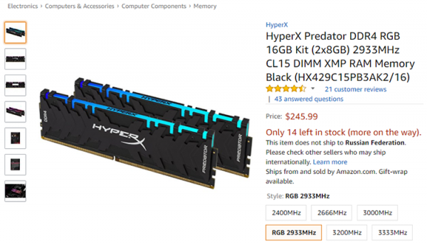На сайте amazon.com двухканальный комплект памяти HyperX Predator DDR4 RGB объёмом 16 Гбайт предлагается по цене $245,99, без налога с продаж. Вдвое больше, $491,99, придётся заплатить за 32-Гбайт набор. Единичный модуль пока не прописался в прайс-листе Amazon, но его стоимость предугадать несложно — $122,99 или чуть выше.