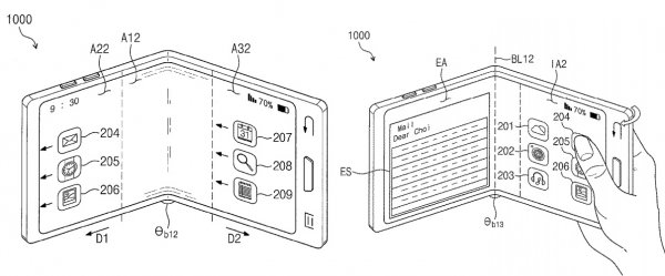 В первом патенте рассказывается об аппарате, который складывается горизонтально по середине экрана. Это может говорить о том, что основное время устройством предложат пользоваться в горизонтальном режиме.