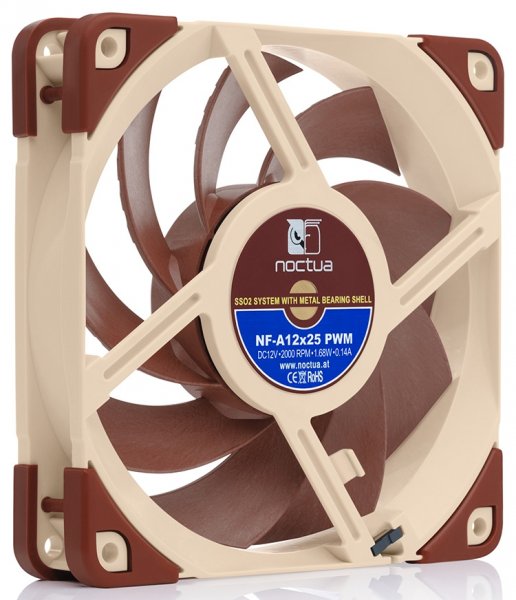 По словам маркетологов Noctua, A12x25 — результат 4,5-летнего проекта по созданию универсального вентилятора для эффективного продува радиаторов систем жидкостного и воздушного охлаждения, а также использования «карлсона» на стенках корпусов. Отличительная особенность A12x25 — едва различимый (0,5 мм) зазор между крыльчаткой и её обрамлением. Шестилетний гарантийный срок демонстрирует уверенность Noctua в том, что даже спустя много лет гидродинамический подшипник SSO2 будет стабилен в работе и не позволит кончикам лопастей задевать рамку.