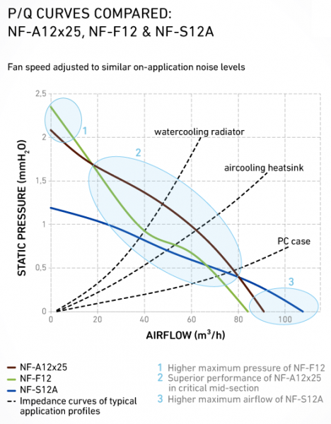 NF-A12x25 PWM: 450–2000 об/мин, 450–1700 об/мин (с резистором L. N. A.), поток до 102,1 м?/ч, шум до 22,6 дБА;