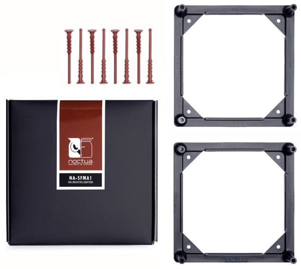 Набор приспособлений NA-SFMA1 позволяет устанавливать 120-мм вентиляторы Noctua на посадочные места под 140-мм вентиляторы. Комплект поставки включает пару рамок NA-FMA1 и восемь антивибрационных силиконовых гвоздиков NA-AV4. Цена комплекта Noctua NA-SFMA1 — $11,90/€11,90.