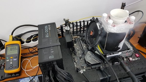 На втором и третьем местах по разгону Ryzen 7 2700X на сегодняшний день обосновались представитель Южной Кореи NAMEGT и тайванец TSAIK. Результат в 5926,51 МГц был получен на вышеупомянутой матплате ASUS и объявлен «тестовым». Процессор, как видно на фото, охлаждался по крайней мере до ?189,9 °C. Экспериментальный стенд, среди прочего, включал модуль оперативной памяти G.Skill Trident Z DDR4 и блок питания EVGA 1600 T2.