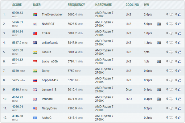 Лучший «тайваньский» результат в 5884,24 МГц показан на материнской плате MSI X470 Gaming M7 AC, с повышением напряжения Vcore до 1,76 В. За TSAIK расположились менее удачливые оверклокеры из Австралии, Индии и Индонезии.