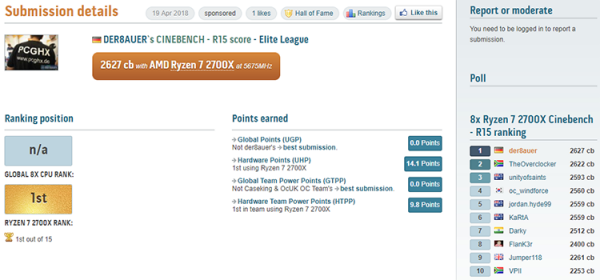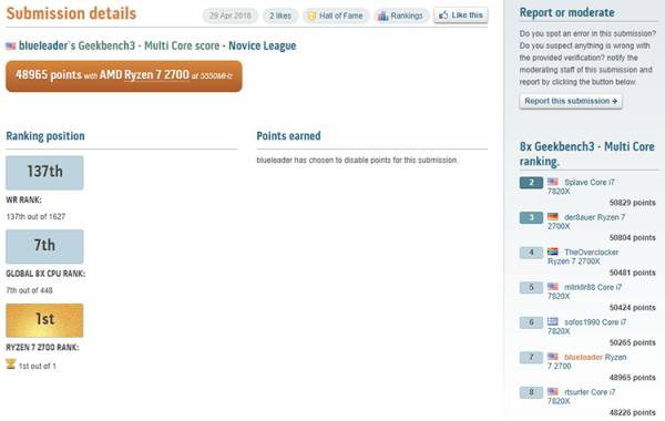 Меньшая активность мастеров разгона наблюдается в отношении более скромных процессоров Pinnacle Ridge — восьмиядерного Ryzen 7 2700, шестиядерных Ryzen 5 2600X и Ryzen 5 2600. Если младшую модель облюбовали любители разгона (что вселяет определённый оптимизм), то Ryzen 7 2700 интересует оверклокеров гораздо меньше. Так, на момент подготовки данной заметки в базе HWBot.org числится только один результат на «2700-м» Ryzen без суффикса «X» — 48 965 очков в многопоточном режиме бенчмарка Geekbench 3 при частота процессора в 5550 МГц. Последняя была достигнута посредством разгона CPU под жидким азотом.