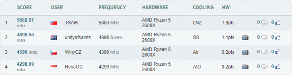 Шестиядерный Ryzen 5 2600X оставил след в дисциплине CPU-Z (максимальная подтверждённая частота процессора) четырьмя записями. Примечательно, что каждая из них содержит отметки о разных системах охлаждения: 5882,97 МГц были «добыты» с помощью жидкого азота, 4898,56 МГц — одноступенчатой системы фазового перехода («фреонки»), 4390 МГц — воздушного охлаждения, 4298,99 МГц — жидкостного охлаждения. Более того, оверклокеры представляют четыре разные страны и использовали четыре разные материнские платы — MSI X470 Gaming Plus (рекорд), ASUS Crosshair VI Hero, ASUS ROG Strix X470-F Gaming и ASRock X470 Taichi Ultimate.