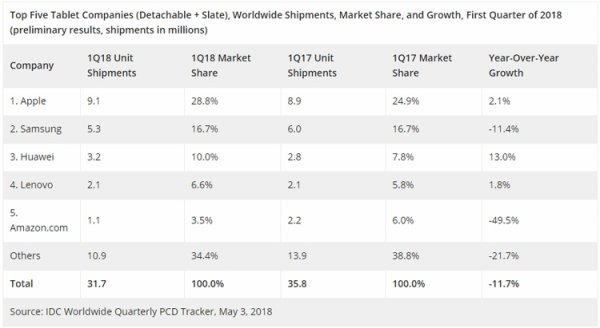 Таким образом, три ведущих поставщика сообща удерживают более половины мирового рынка планшетов. Отмечается также, что в пятёрку крупнейших производителей входят Lenovo и Amazon с долями соответственно 6,6 % и 3,5 %.