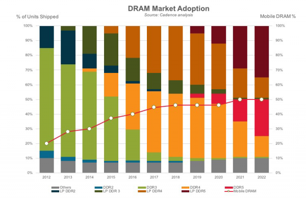 График Cadence, иллюстрирующий соотношение разных типов оперативной памяти на рынке в 2012–22 гг., указывает на то, что в эру DDR5 низковольтные чипы (LPDDR5) будут распространены больше, чем обычные. В 2019–20 гг. влияние DDR5 на рынок вычислительных устройств будет небольшим, но уже в 2021 году DDR5 и LPDDR5 сравняются по объёмам выпуска с нынешним дуэтом DDR4 и LPDDR4, а ещё через год DDR пятого поколения станет доминирующим типом оперативной памяти.
