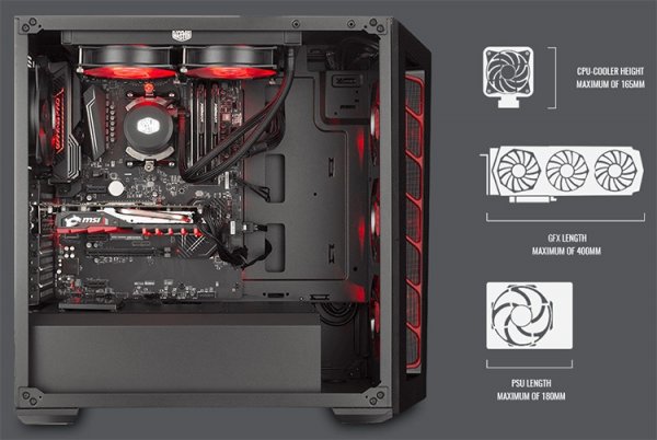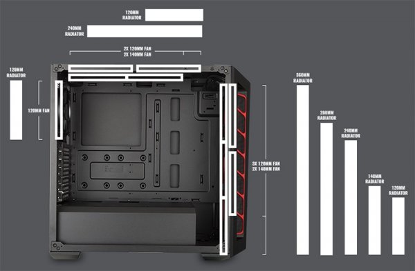 Ассортимент корпусов компании Cooler Master продолжает активно пополняться моделями MasterBox, сочетающими в себе как привычные элементы, так и оригинальные решения. На этот раз тайваньский производитель решил порадовать любителей «гоночного» внешнего вида комплектующих Mid-Tower корпусом MasterBox MB510L. Продукт появится в продаже в четырёх цветовых вариантах обрамления передней панели — красном (артикул MCB-B510L-KANN-S00), чёрном (MCB-B510L-KANN-S01), белом (MCB-B510L-KANN-S02) и синем (MCB-B510L-KANN-S03). Сама лицевая панель имеет «карбоновую» текстуру, но рассчитывать на то, что она действительно изготовлена из углеволокна, конечно не стоит. Основными материалами, используемыми в производстве MasterBox MB510L, являются сталь, пластик и, по-видимому, акрил. Новинка, среди прочего, примечательна наличием прозрачной левой боковой панели и возможностью установки сразу трёх радиаторов СЖО. Габариты конструкции равны 496(Д) ? 217(Ш) ? 468(В) мм, масса в спецификации не указана. Системный отсек корпуса не изобилует большим количеством деталей. Он позволяет разместить материнскую плату форм-фактора ATX (максимальный размер — 272 ? 305 мм), Micro-ATX или Mini-ITX, семь плат расширения PCI/PCI Express, радиаторы систем жидкостного охлаждения типоразмеров 120 мм (на задней стенке), 120–240 мм (сверху) и 120–360 мм (спереди). По умолчанию на задней панели установлен 120-мм вентилятор. В случае если монтаж СЖО не планируется, свободными остаются посадочные места для дополнительных вентиляторов — пяти 120-мм либо четырёх 140-мм. Под кожухом внизу можно разместить ATX-совместимый блок питания длиной до 180 мм и два 2,5- или 3,5-дюймовых накопителя. Ещё четыре 2,5-дюймовых SSD/HDD могут «поселиться» за поддоном для материнской платы и на кожухе БП. Ограничения высоты процессорного кулера в 165 мм и длины видеокарт в 400 мм не станут проблемой для абсолютного большинства энтузиастов, хотя отдельные модели CPU-кулеров достигают 170–172 мм в высоту — взять хотя бы тот же Cooler Master MasterAir Maker 8. На панели I/O корпуса находятся два разъёма USB 3.0, гнёзда для наушников и микрофона. Рекомендованная цена MasterBox MB510L пока известна только для рынка Великобритании — ?49,99 (с учётом НДС).