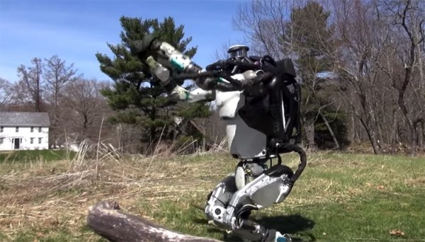 Компания Boston Dynamics представила новый видеоролик (см. ниже), демонстрирующий последние достижения в разработке человекоподобного робота Atlas. Фирма Boston Dynamics была основана в 1992 году Марком Райбертом (Marc Raibert). В декабре 2013 года компания была куплена корпорацией Google. А летом прошлого года Boston Dynamics перешла во владение японской телекоммуникационной и медиакорпорации SoftBank Group. Но вернёмся к роботу Atlas. Эта двуногая антропоморфная машина создана по заказу Управления перспективных исследований Министерства обороны США (DARPA). Руки робот может использовать для переноса груза или при преодолении вертикальных препятствий. В новом видеоролике Atlas вышел на уличную прогулку. На этот раз он не привязан кабелями ни к источнику питания, ни к внешним компьютерным модулям. Иными словами, робот находится в «свободном плавании». В ролике показано, как машина бежит по пересечённой местности, уверенно сохраняя равновесие. Наткнувшись на препятствие в виде бревна, Atlas смог его перепрыгнуть. Правда, сделал он это не на ходу, а после остановки и непродолжительной подготовки.